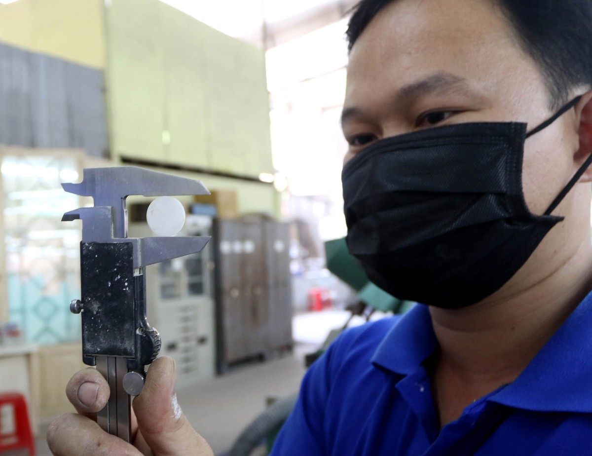 Công nhân tay nghề cao, kiểm tra độ dày của vỏ trai sau khi thực hiện khâu mài.
