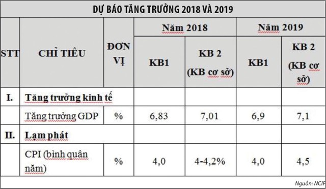 Năm 2019, NCIF dự báo kịch bản 1 là GDP đạt mức tăng 6,9%, tương ứng với mức tăng chỉ số CPI là 4%; kịch bản 2 - kịch bản cơ sở - đạt mức tăng trưởng khá cao 7,1%.