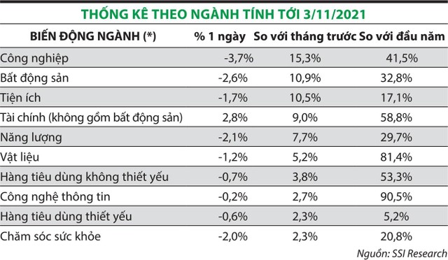 Nhìn chung, xu hướng dòng tiền trong giai đoạn cuối tháng 9 tới nay có sự dịch chuyển vào các nhóm cổ phiếu có câu chuyện kỳ vọng hưởng lợi, cũng như câu chuyện kỳ vọng tái định giá lại tài sản trong tương lai gần. Tuy nhiên, sau khi liên tục tăng nóng, thị trường đang có dấu hiệu rung lắc khi phiên giao dịch ngày 3/11/2021, các cổ phiếu bất động sản thương mại, công nghiệp, phân bón, vận tải đều có dấu hiệu bị chốt lời mạnh.