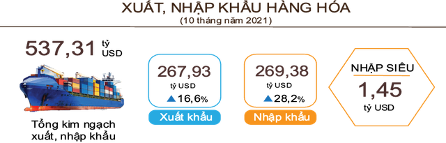 Cán cân thương mại hàng hóa thực hiện tháng 9 xuất siêu 360 triệu USD; 9 tháng nhập siêu 2,55 tỷ USD; tháng 10 ước tính xuất siêu 1,1 tỷ USD. Tính chung 10 tháng năm 2021, cán cân thương mại hàng hóa nhập siêu 1,45 tỷ USD (cùng kỳ năm trước xuất siêu 19,63 tỷ USD), trong đó khu vực kinh tế trong nước nhập siêu 22,73 tỷ USD; khu vực có vốn đầu tư nước ngoài (kể cả dầu thô) xuất siêu 21,28 tỷ USD.