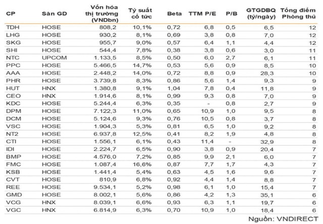 Điểm đáng lưu ý trong phương pháp tính điểm này là mặc dù tỷ suất cổ tức trên toàn thị trường khá thấp và vẫn trong xu hướng giảm, nhưng có không ít cổ phiếu trả cổ tức hấp dẫn. VNDS cho biết, có 489 cổ phiếu có tỷ suất cổ tức trên 7% và 303 cổ phiếu có tỷ suất cổ tức trên 10% trong tổng số doanh nghiệp niêm yết (có 45,6% tổng số cổ phiếu niêm yết không chi trả cổ tức).