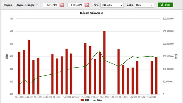 Giá trị vốn hóa thị trường tại thời điểm cuối tháng 11 đạt hơn 485 nghìn tỷ đồng, tăng 10,22% so với cuối tháng trước. Trong tháng 11, thị trường niêm yết HNX có thêm 4 doanh nghiệp niêm yết mới và 6 doanh nghiệp niêm yết bổ sung với tổng khối lượng niêm yết bổ sung đạt 138,9 triệu cổ phiếu.
