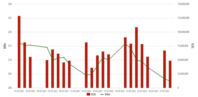 Chỉ số HNX-Index biến động tăng, giảm mạnh trong biên độ từ 202,38 - 216,01 điểm và đóng cửa phiên cuối cùng của tháng vào ngày 28/2 đạt mức thấp nhất tháng là 202,38 điểm, giảm 9,01% so với thời điểm cuối tháng 1/2023.