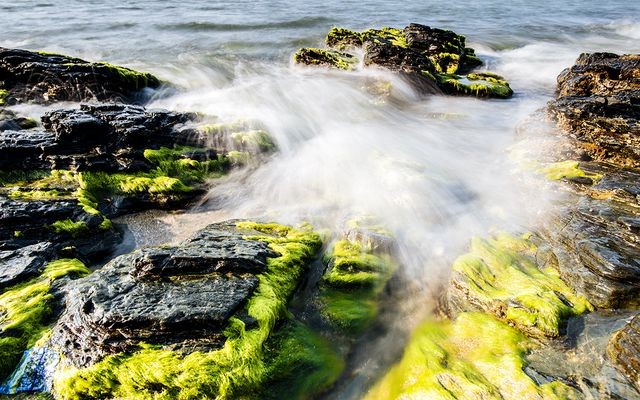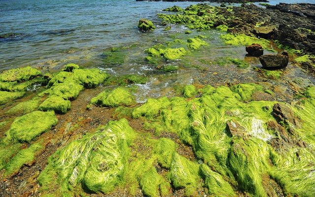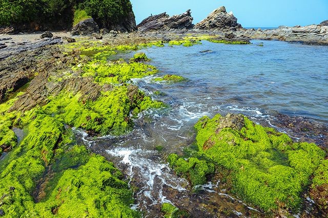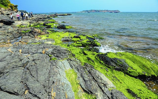 Những thảm rêu xanh mướt bên dòng biển xanh ở Tam Hải.