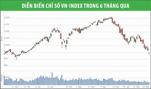 Từ vùng đỉnh 1.200 điểm ngày 9/4, cho đến phiên 28/5, tức trong vòng gần 2 tháng, VN-Index giảm khoảng 270 điểm, tương đương mức giảm trên 22%. Không ít cổ phiếu có mức giảm mạnh hơn nhiều so với chỉ số, thậm chí giảm hơn 50% như LAF, HSG, TRA, DCL…