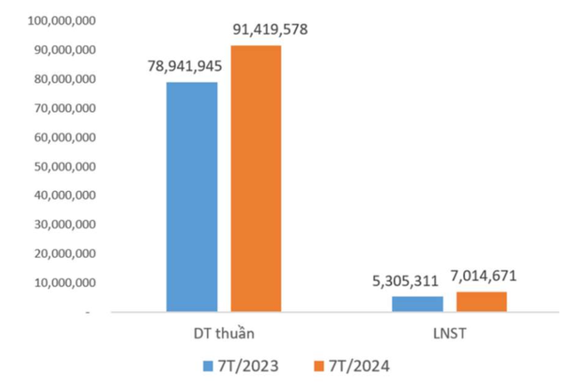 Kết quả hoạt động kinh doanh tháng 7 năm 2024 của Công ty mẹ, doanh thu là hơn 17 triệu USD, tăng 36% so với cùng kỳ tháng 7 năm 2023. Lợi nhuận sau thuế tháng 7 đạt hơn 1,17 triệu USD, tăng 48%.