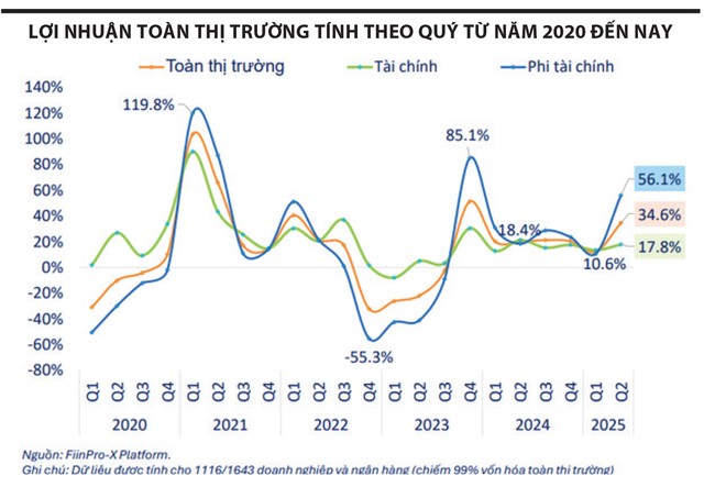 Quý II/2025 đem đến bức tranh lợi nhuận tưởng như bùng nổ của doanh nghiệp niêm yết, với mức tăng trưởng 34,6% so với cùng kỳ - cao nhất trong 6 quý. Tuy nhiên, đằng sau con số ấn tượng lại tiềm ẩn nhiều yếu tố đáng lo ngại. Phần lớn đà tăng đến từ nhóm phi tài chính với mức tăng 56,1%, song gần 15% lợi nhuận đến từ các khoản thu nhập bất thường như đánh giá lại tài sản hay lãi tỷ giá hối đoái. Loại trừ yếu tố này, lợi nhuận lõi thực chất chỉ còn tăng 26,5% và đã giảm tốc hai quý liên tiếp.