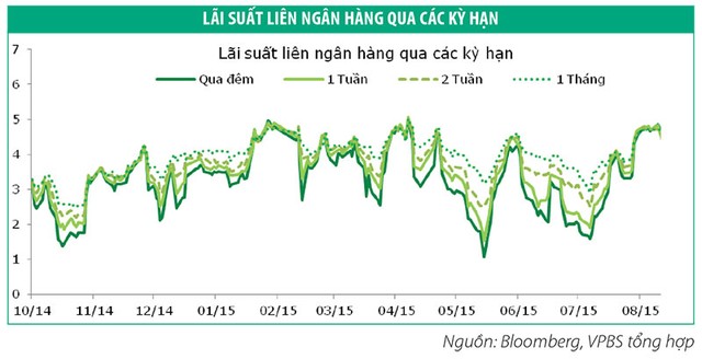 Trong tuần trước đó, NHNN cam kết giữ nguyên mức lãi suất cơ bản và không tăng tỷ giá từ nay cho đến cuối năm. Nhu cầu vay vốn ngắn hạn để đầu cơ tỷ giá cũng vì vậy giảm dần, dẫn tới việc lãi suất giảm mạnh. Tuy nhiên, lãi suất liên ngân hàng đã bật tăng khá cao tại tất cả các kỳ hạn trong tuần đầu tiên của tháng 9 khi nhu cầu vay vốn của các ngân hàng tăng vào đầu tháng để đáp ứng mức dự trữ bắt buộc của NHNN. Theo Bloomberg, lãi suất qua đêm là 3,9%/năm, 1 tuần 4,1%/năm; 2 tuần là 4,3%/năm, 1 tháng là 4,4%/năm.