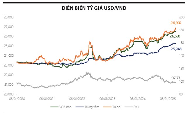 Thời gian vừa qua, diễn biến tỷ giá khá căng thẳng. Tỷ giá bán của Vietcombank (VCB) cuối tháng 8 đã chạm mốc 26.500 VND/USD (tăng 3,72% so với cùng kỳ năm ngoái), tỷ giá trung tâm đạt 25.204 VND/USD (tăng 3,72% so với cùng kỳ), trong khi tỷ giá trên thị trường tự do tiệm cận ngưỡng 27.000 VND/USD. Nguyên nhân chủ yếu đến từ: nhu cầu dự trữ ngoại tệ gia tăng trong bối cảnh thương mại còn nhiều bất ổn; Kho bạc Nhà nước chào mua USD từ các ngân hàng thương mại, khiến nguồn cung ngoại tệ bị thu hẹp.