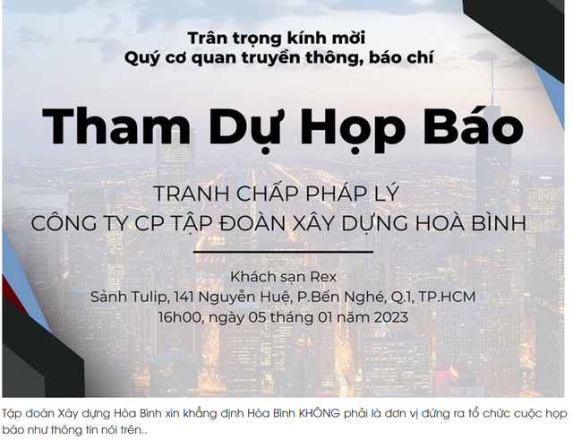 Sáng nay (5/1), trang web của Tập đoàn Hòa Bình đã phát đi Thông báo về việc: “Tập đoàn Xây dựng Hòa Bình nhận được thông tin từ các cơ quan truyền thông về việc Hòa Bình sẽ tổ chức họp báo “tranh chấp pháp lý” tại Công ty cổ phần Tập đoàn Xây dựng Hòa Bình vào chiều ngày 05/01/2023 tại khách sạn Rex, số 141 Nguyễn Huệ, phường Bến Nghé, quận 1, TP.HCM. Thông tin theo hình ảnh thư mời bên dưới.