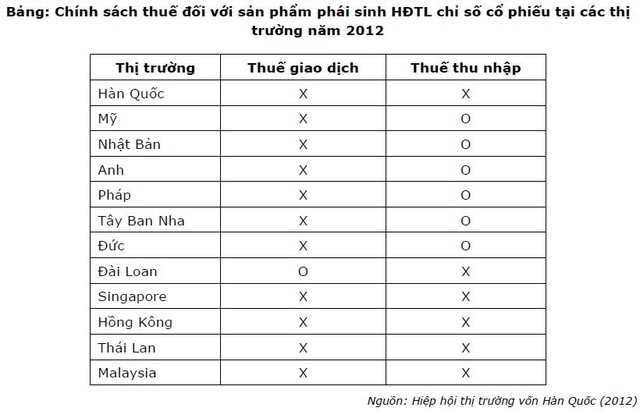 Thống kê dưới đây của Hiệp hội thị trường vốn Hàn Quốc tại thời điểm 2012 cho thấy, không nhiều quốc gia áp thuế lên giá trị chuyển nhượng/giao dịch hợp đồng tương lai. Các quốc gia áp thuế lên khoản lãi từ đầu tư hợp đồng tương lai chỉ số cổ phiếu chủ yếu là các nước như Mỹ, châu Âu khi mà mức thuế thu nhập cá nhân trung bình của các nước này ở mức rất cao so với các nước châu Á.