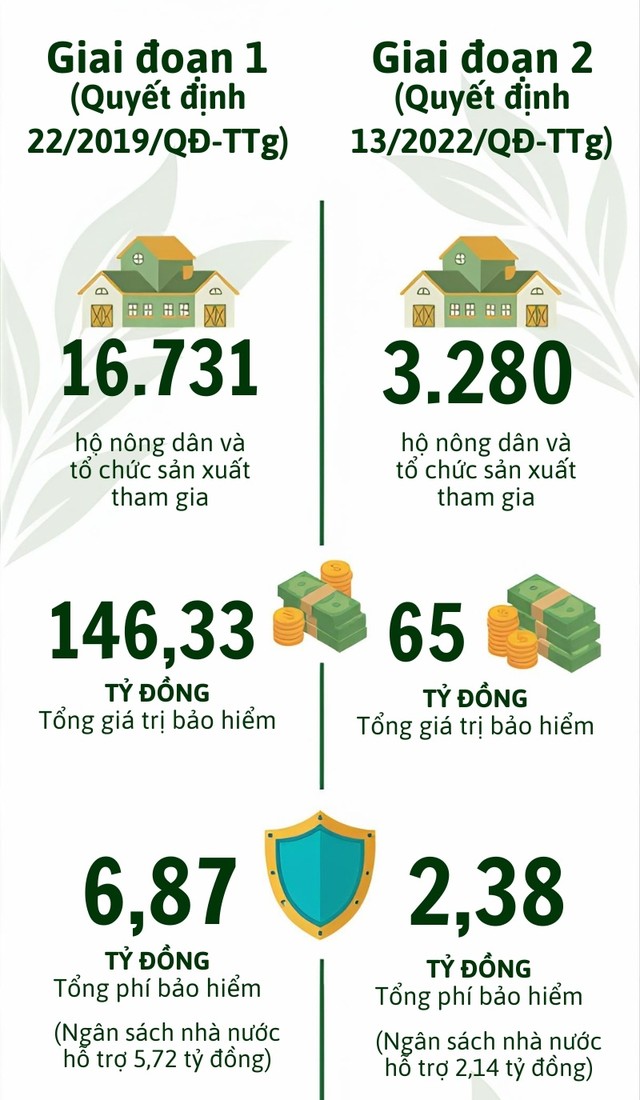 Ở giai đoạn tiếp theo theo Quyết định số 13/2022/QĐ-TTg, có 3.280 hộ và tổ chức tham gia bảo hiểm nông nghiệp với tổng giá trị bảo hiểm khoảng 65 tỷ đồng. Tổng phí bảo hiểm đạt 2,38 tỷ đồng, trong đó ngân sách nhà nước hỗ trợ khoảng 2,14 tỷ đồng. Phạm vi đối tượng được hỗ trợ cũng từng bước được mở rộng sang nhiều loại cây trồng, vật nuôi và thủy sản hơn.
