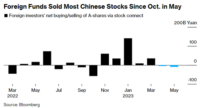 Tâm lý bi quan xuất hiện ở mọi nơi. Các quỹ nước ngoài đang giảm tỷ trọng với cổ phiếu Trung Quốc trong tháng 5/2023, đánh dấu tháng rút vốn thứ 2 liên tiếp. Đây là lần đầu tiên nhà đầu tư nước ngoài rút vốn trong 2 tháng liên tiếp kể từ tháng 10/2022.
