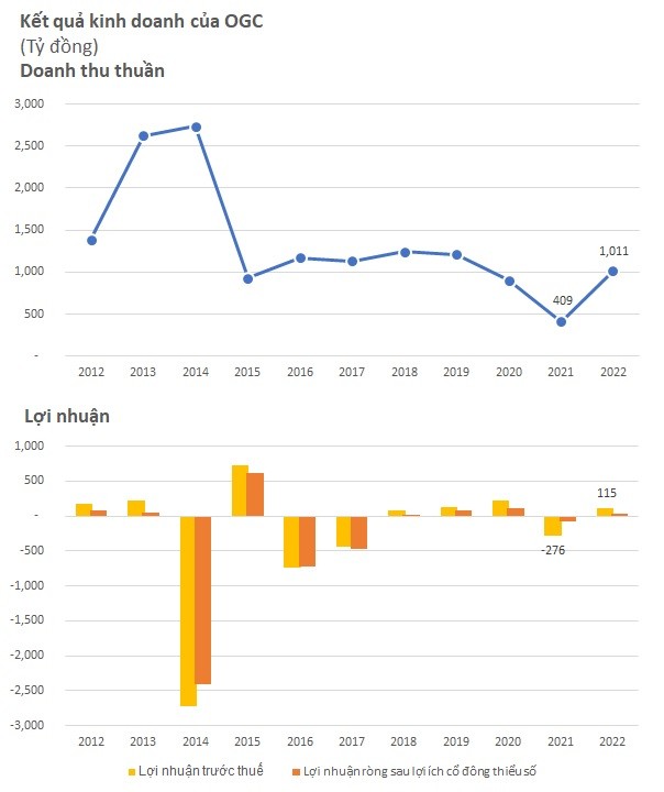 Năm vừa qua, doanh thu của OGC tăng hơn gấp đôi từ 409 tỷ lên 1.011 tỷ đồng. Lợi nhuận trước thuế từ mức âm 276 tỷ đồng trở lại con số dương, đạt 115 tỷ đồng, tương ứng hoàn thành 109% kế hoạch doanh thu và 212% kế hoạch lợi nhuận trước thuế.