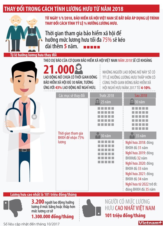 Từ ngày 1/1/2018, Bảo hiểm xã hội Việt Nam sẽ bắt đầu áp dụng lộ trình thay đổi cách tính tỷ lệ % hưởng lương hưu. Thời gian tham gia bảo hiểm xã hội để hưởng mức lương hưu tối đa 75% sẽ kéo dài thêm 5 năm.
