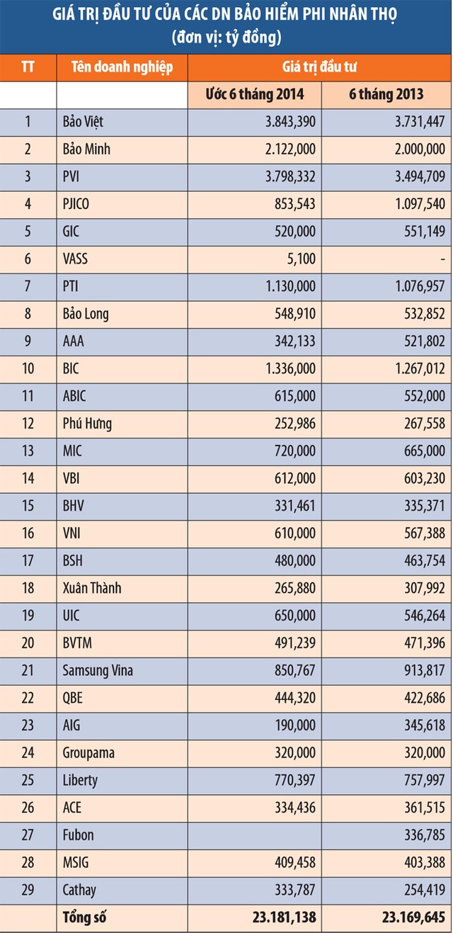 So với cùng kỳ năm ngoái, tổng giá trị đầu tư của khối DN bảo hiểm phi nhân thọ trong 6 tháng đầu năm 2014 chỉ tăng nhẹ 0,05% (xem bảng). Mức tăng này chậm hơn rất nhiều so với mức tăng của khối bảo hiểm nhân thọ, khi khối này đầu tư trở lại nền kinh tế khoảng 93.137 tỷ đồng, tăng 16% so với cùng kỳ năm ngoái. Riêng 7 DN bảo hiểm phi nhân thọ đứng đầu thị trường về thị phần doanh thu phí bảo hiểm gốc chiếm trên 60% giá trị đầu tư của khối này, ước đạt hơn 12.000 tỷ đồng.