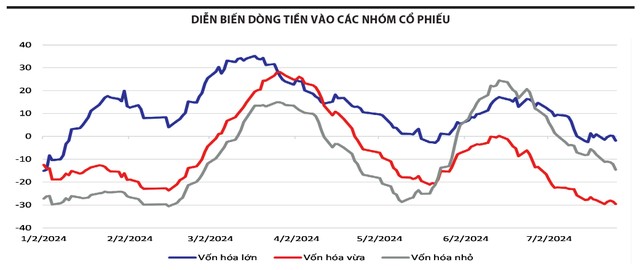 Dù thanh khoản chung của thị trường suy giảm trong 1 tháng qua, nhưng điểm nhấn tích cực là dòng tiền chủ yếu chảy vào nhóm cổ phiếu vốn hóa lớn, trong khi dòng tiền rút ra ở nhóm vốn hóa nhỏ, còn nhóm vốn hóa vừa chưa nhận được sự quan tâm của nhiều nhà đầu tư. Sự luân chuyển của dòng tiền tới các cổ phiếu vốn hóa lớn giúp chỉ số chung khó xảy ra tình huống giảm quá mạnh, vì lực mua vẫn chực chờ canh giá rẻ ở cổ phiếu doanh nghiệp lớn, đầu ngành.