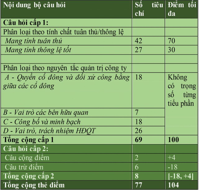 Điểm số của bộ tiêu chí được xác định là tổng điểm của tiêu chí Cấp 1 và Cấp 2. Cấp 1, doanh nghiệp có thể đạt tối đa 100 điểm, bao gồm 42 câu hỏi có tính tuân thủ và 27 câu hỏi có tính thông lệ. Trọng số điểm của phần tuân thủ là 70% và phần thông lệ là 30%.