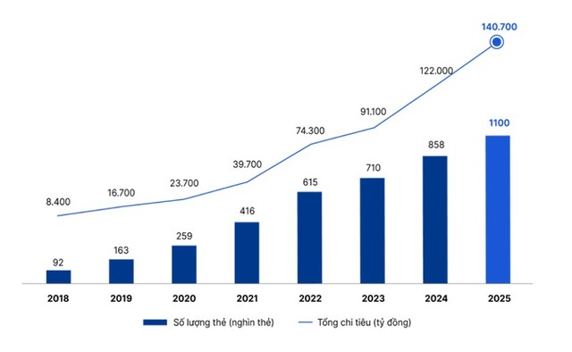 Về chất lượng tăng trưởng, đến cuối năm 2025, tổng chi tiêu thẻ tín dụng VIB tăng gấp 17 lần so với năm 2018, đạt xấp xỉ 5,4 tỷ đô. Trung bình mỗi chủ thẻ chi tiêu khoảng 15 triệu đồng/tháng - gấp đôi so với năm 2018 và cao hơn 50% so với trung bình toàn ngành.
