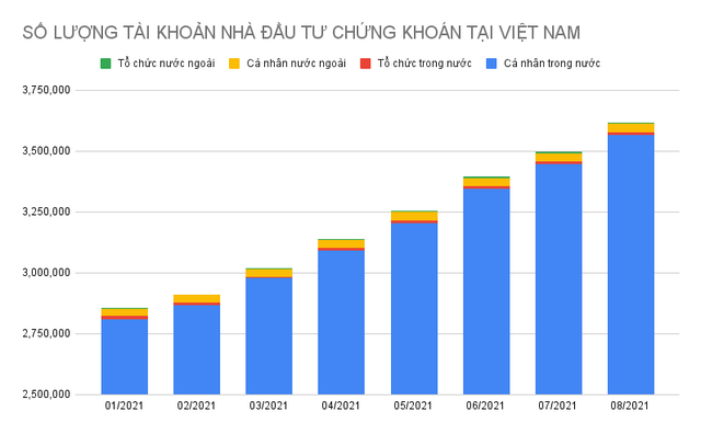 Lũy kế 8 tháng đầu năm, nhà đầu tư trong nước mở mới 842.405 tài khoản chứng khoán, lớn hơn tổng số tài khoản mở mới trong 3 năm 2018-2020 cộng lại là 837.345 tài khoản.