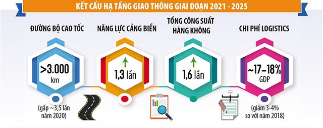 Theo đó, trong 5 năm tới sẽ tập trung đầu tư, xây dựng các trục giao thông đường bộ cao tốc quan trọng; các cảng biển cửa ngõ kết hợp trung chuyển quốc tế; các cảng hàng không lớn; tuyến đường sắt tốc độ cao trên trục Bắc - Nam; hệ thống đường sắt đô thị tại Hà Nội và TP.HCM; các tuyến đường sắt kết nối và các cảng biển trung chuyển quốc tế; phấn đấu hoàn thành tuyến đường sắt Lào Cai - Hà Nội - Hải Phòng trước năm 2030.