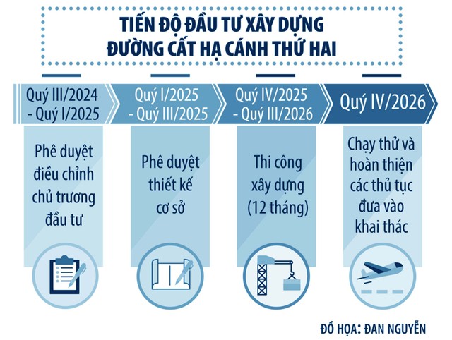 Trong đó, khoản 6, Điều 2 quy định: thời gian và lộ trình đầu tư đường cất hạ cánh thứ hai sẽ nằm trong giai đoạn II và có cấu hình mở; Chính phủ chỉ đạo lập báo cáo nghiên cứu khả thi đối với từng giai đoạn của Dự án và báo cáo Quốc hội thông qua trước khi quyết định đầu tư.
