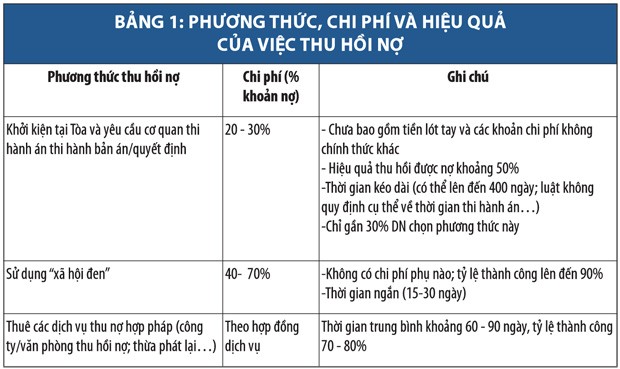 Tuy nhiên, nghiên cứu do VCCI công bố tại hội thảo “Luật Thi hành án dân sự - Từ góc nhìn DN” vừa tổ chức đã khiến không ít người giật mình về tính hiệu quả của các phương thức thu hồi nợ chính thống. Bảng 1 sẽ cho chúng ta thấy phương thức, chi phí và hiệu quả của việc thu hồi nợ theo góc nhìn của DN.