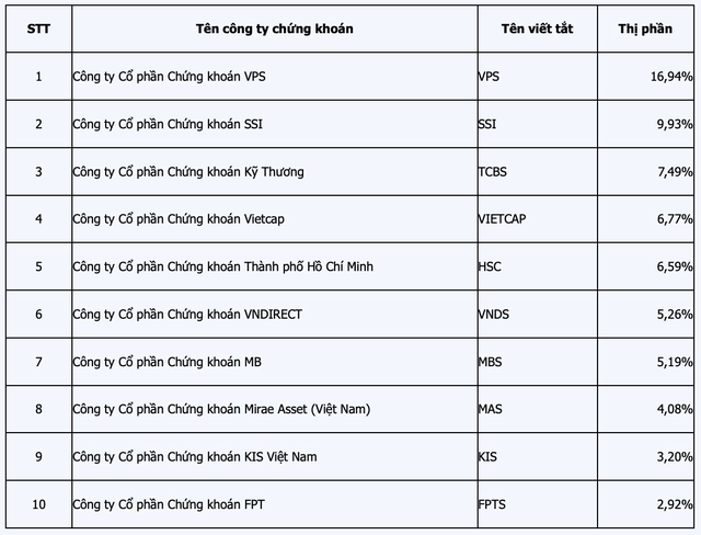 Sự thay đổi đáng kể nhất là việc FPTS thế chân VCBS để lọt top 10 và Vietcap vượt qua HSC lên vị trí thứ 4 với thị phần 6,77%.