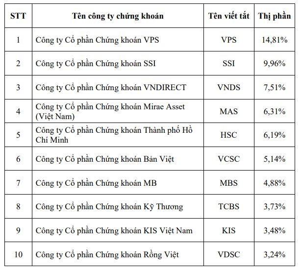 Ở top dưới, lần đầu tiên chứng khoán Rồng Việt lọt vào top 10, ghi nhận thị phần 3,24%.