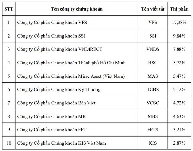 VNDS giảm nhẹ 7,72% về 7,51%; Mirae Asset tăng từ 5,85% lên 6,31%; HSC cũng tăng nhẹ lên 6,9%.
