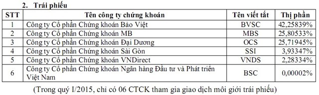Đầu tiên là về số lượng các CTCK tham gia giao dịch môi giới trái phiếu, quý I này chỉ có 6 đơn vị tham gia, thay vì 9 đơn vị như ở quý IV/2014.
