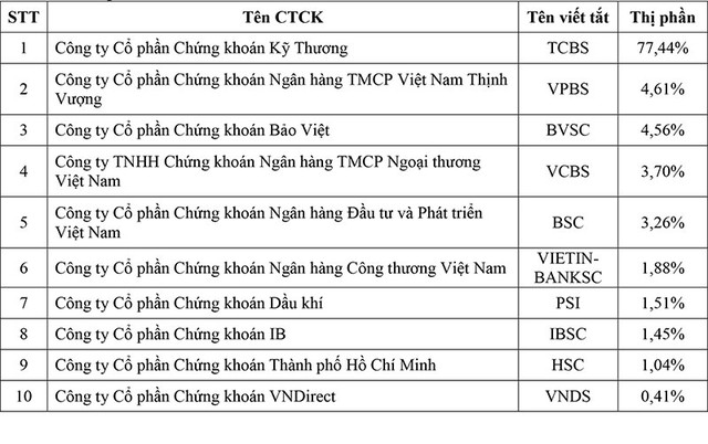 Về thị phần môi giới trái phiếu, số lượng công ty chứng khoán tham gia giao dịch môi giới trong quý IV/2017 là 10 công ty. Trong đó, Chứng khoán Kỹ Thương (TCBS) tiếp tục dẫn đầu toàn thị trường với thị phần đạt 77,44%. Đứng ở vị trí thứ 2 là VPBS với thị phần đạt 4,61%.