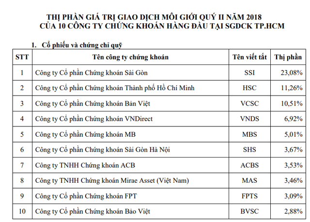 Tính chung 6 tháng, SSI dẫn đầu với thị phần 20,91%, kế đến là HSC 11,73%, VCI với 9,58%...