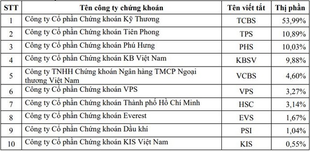 Đối với môi giới trái phiếu, Chứng khoán Techcombank (TCBS) dù có thị phần sụt giảm khá mạnh nhưng vẫn đứng đầu và bỏ xa các công ty chứng khoán còn lại, với thị phần đạt 53,99% (trong khi quý I/2020 đạt thị phần 82,43%).