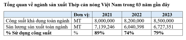 Cụ thể, năm 2022, các nhà máy sản xuất thép trong nước đã phải cắt giảm sản lượng sản xuất, cho người lao động làm việc luân phiên. Theo số liệu thống kê, tỷ lệ sản lượng sản xuất HRC /công suất khả dụng toàn ngành của doanh nghiệp trong nước suy giảm trong 3 năm từ 89% năm 2021 xuống 79% năm 2023.
