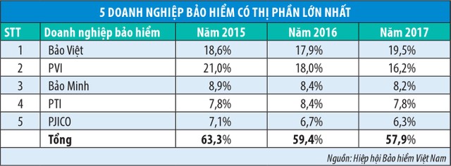 Trong khi đó, theo thống kê qua từng năm của Hiệp hội Bảo hiểm Việt Nam giai đoạn 2015 - 2017, thị phần của Top 5 giảm dần đều, từ 63,3% tổng doanh thu xuống 59,4% và 57,9%.