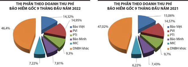 Tiếp đến là Bảo hiểm Bảo Việt với doanh thu phí gốc ước đạt 7.268.172 tỷ đồng, chiếm thị phần 14,32%, PTI ước đạt 4.721 tỷ đồng, chiếm thị phần 9,30%, Bảo Minh ước đạt 3.964 tỷ đồng, chiếm thị phần 7,81%, MIC ước đạt 3.663 tỷ đồng, chiếm thị phần 7,22%. Tính chung thị phần 9 tháng đầu năm 2022 của 5 doanh nghiệp nhóm đầu là 53,6%, tăng nhẹ so với mức 52,98% cùng kỳ năm ngoái.