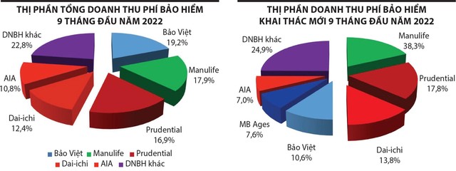 Thị phần doanh thu phí bảo hiểm của khối nhân thọ cơ bản vẫn ổn định. Cụ thể, Bảo Việt Nhân thọ dẫn đầu với 19,2% thị phần, Manulife 17,9%, Prudential 16,9%, Dai-ichi Life 12,4%, AIA 10,8%, MB Ageas 3,8%, FWD 3,2%, Sun Life 2,9%, Generali 2,8%, Hanwha Life 2,5%, Chubb Life 2,3%, Cathay 1,7%, MVI 1,5%, BIDV-MetLife 1%, các doanh nghiệp còn lại chiếm thị phần nhỏ, dưới 1%.