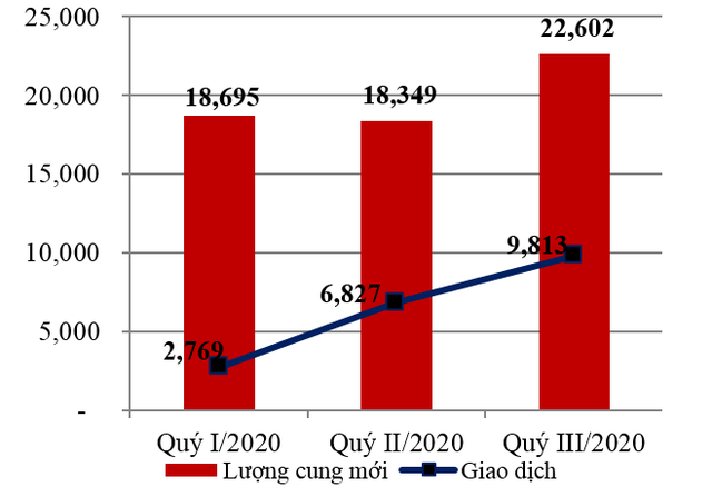 Đối với 22.602 sản phẩm mới được chào bán trong quý III/2020, tỷ lệ giao dịch là 9.813/22/602 sản phẩm, tương đương tỷ lệ hấp thụ 43,4%, cao hơn nhiều tăng khoảng 3,54 lần so với quý I/2020 và 1,43 lần so với quý II/2020.