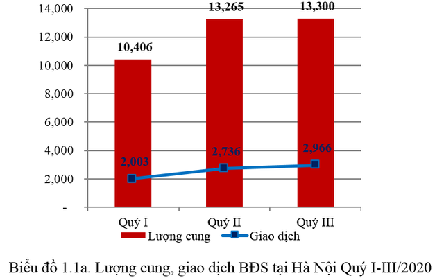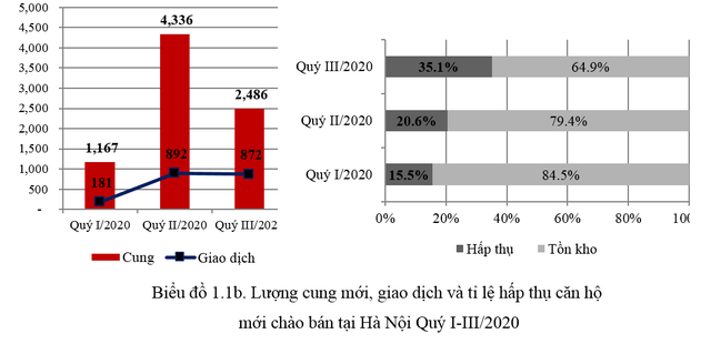 Đối với riêng từng thị trường cũng có sự phân hóa khá rõ rệt, khi tổng lượng sản phẩm được bán trên toàn thị trường Hà Nội quý III/2020 đạt 13.300 sản phẩm (chủ yếu là căn hộ chung cư), giao dịch 2.966/13.300 sản phẩm, tương ứng tỉ lệ hấp thụ đạt 22,3%.