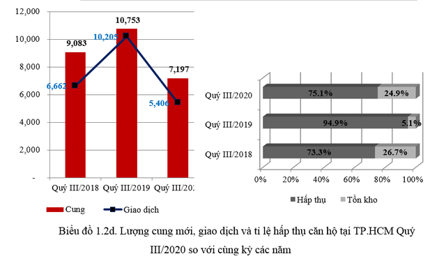 Đối với TP.HCM, ghi nhận của VARS cho biết, tổng lượng sản phẩm được bán trên toàn thị trường trong quý III/2020 đạt 12.530 sản phẩm (chủ yếu là căn hộ chung cư), giao dịch 9.408/12.530 sản phẩm, với tỉ lệ hấp thụ tương đương 75,1%.