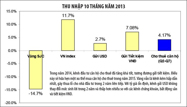 Bất động sản cho thuê trong năm 2014 cũng là kênh đầu tư khá hấp dẫn so với năm 2013. Giá cho thuê căn hộ tại quận 2 và quận 7, TP.HCM đã tăng nhẹ, với mức sinh lời gần 7%/năm so với mức 5% của năm 2013.