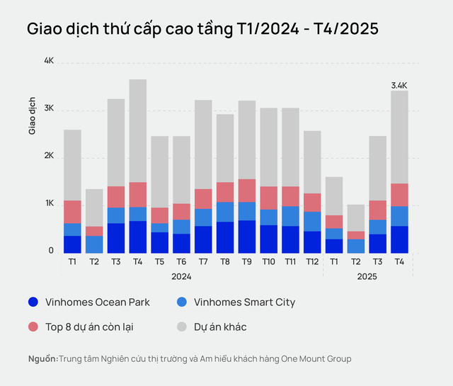 Cụ thể, trong tháng 4/2025 tổng giao dịch thứ cấp toàn thị trường đạt khoảng 7.600 căn, tăng 67% so với tháng 3, và cao hơn mức trung bình toàn thị trường (6.150 căn/tháng).