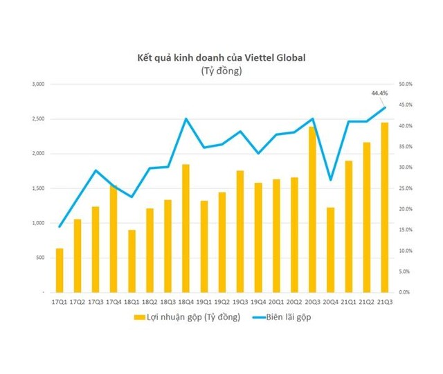 Tổng CTCP Đầu tư Quốc tế Viettel – Viettel Global (UpCom: VGI) vừa công bố kết quả kinh doanh quý 3 với doanh thu hợp nhất đạt 5.514 tỷ đồng, giảm nhẹ 200 tỷ đồng so với cùng kỳ trước. Doanh thu sụt giảm chủ yếu đến từ mảng kinh doanh thiết bị có margin thấp, do vậy mà lãi gộp vẫn tăng 2% lên 2.450 tỷ đồng. Cả 3 quý đầu năm 2021, tỷ suất lãi gộp trên doanh thu của Viettel Global đều đạt trên 40%, trong đó riêng quý 3 đạt 44,4% - là mức cao nhất từ trước đến nay.