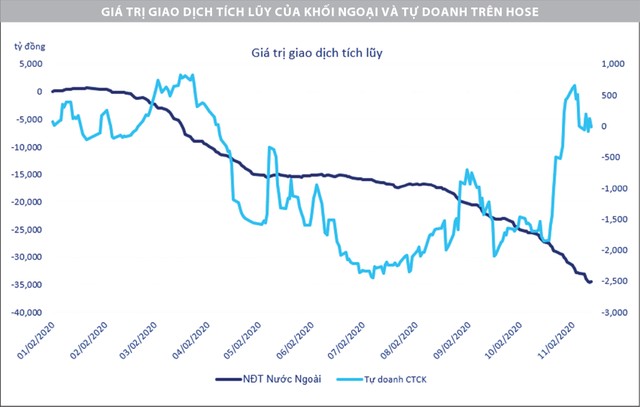 Nhà đầu tư nước ngoài trong tuần qua duy trì đà bán ròng, tổng giá trị bán ròng gần 1.500 tỷ đồng trên sàn HOSE. Ngoài ra, tự doanh công ty chứng khoán có động thái bán ròng trong ngắn hạn, nhưng đã chững lại so với tuần trước đó (tuần qua bán ròng 10 tỷ đồng, trong khi tuần trước đó bán ròng 444 tỷ đồng).