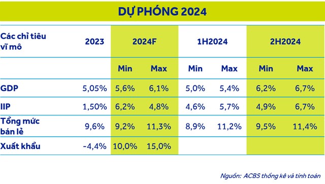 Trong năm 2024, chúng tôi dự báo Việt Nam có thể đạt mức tăng trưởng GDP từ 5,6 - 6,1% so với năm 2023, căn cứ trên các dự báo về xu hướng tiếp tục hồi phục của xuất khẩu, tiêu dùng bán lẻ và FDI. Đặc biệt, lĩnh vực đầu tư công tiếp tục được đẩy mạnh, có thể tạo ra ảnh hưởng tích cực lan tỏa đối với nền kinh tế. Tỷ giá ổn định, môi trường lãi suất tiếp tục được duy trì ở mức thấp, hỗ trợ cho các doanh nghiệp.