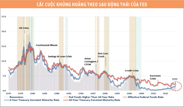 Tại Mỹ, theo thống kê, Fed luôn là chất xúc tác phía sau mọi sự kiện tài chính kể từ khi cơ quan này được chủ động điều hành chính sách tiền tệ vào cuối những năm 70. Các số liệu cho thấy, mỗi khi Fed nâng mức lãi suất cho vay ngắn hạn lên cao hơn lãi suất 10 năm thì tiếp theo sau đó là những cuộc khủng hoảng.