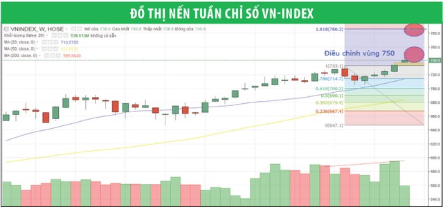 Hiện tại, chỉ số VN-Index đang gặp thử thách tiếp cận vùng kháng cự 750 điểm, tương ứng thang fibo 127,2% và diễn biến điều chỉnh biên độ hẹp có thể diễn ra trong một thời gian, rất có thể sẽ sớm quay đầu lấp khoảng trống mà nó đã tạo ra ở vùng 730 - 732 điểm.