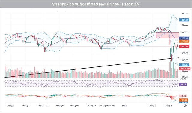 Chúng tôi nhận thấy, có sự ổn định trong hành vi mua bán quanh vùng hỗ trợ mạnh 1.180 - 1.200 điểm. Điều này không chỉ có ý nghĩa về mặt kỹ thuật, mà còn thể hiện tâm lý ổn định hơn do dòng tiền mua mang tính chất dài hạn hơn. Nếu vùng hỗ trợ này được giữ vững, thị trường có thể xác lập xu hướng phục hồi bền vững, với mục tiêu ngắn hạn là 1.250 điểm và trong trường hợp đàm phán tốt, mục tiêu xa hơn là vùng 1.300 điểm.