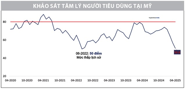 Dữ liệu mới công bố cho thấy, sức khỏe của nền kinh tế toàn cầu vẫn đang đối mặt với nhiều rủi ro tiềm ẩn. Tại Mỹ, chỉ số niềm tin tiêu dùng do Đại học Michigan công bố bất ngờ lao dốc, xuống còn 50,8 điểm, mức thấp thứ hai trong vòng hơn 70 năm qua. Điều đáng lo ngại là con số này thậm chí còn thấp hơn mức ghi nhận trong cuộc khủng hoảng tài chính toàn cầu năm 2008, phản ánh tâm lý bất an sâu sắc của người tiêu dùng trước nguy cơ lạm phát kéo dài, bất ổn địa chính trị và những quyết sách khó đoán từ chính quyền Tổng thống Donald Trump, đặc biệt là trong lĩnh vực thương mại.